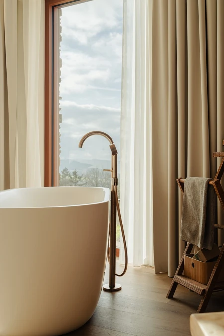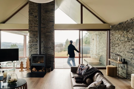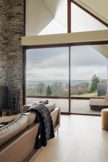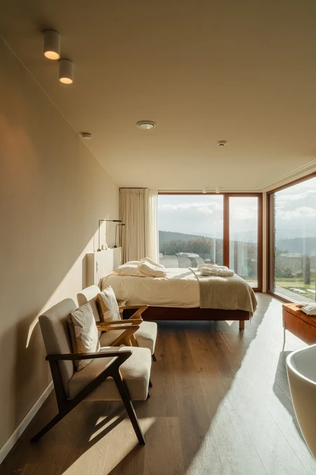 Vid ankomsten slås man omedelbart av den hisnande utsikten. Tack vare de stora fönsterpartierna tas det panoramiska landskapet in som en levande tavla. Man har medvetet valt en öppen planlösning, så att ljus och rymd står i centrum. Varje detalj i inredningen förstärker känslan av harmoni med naturen.