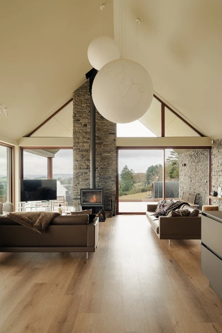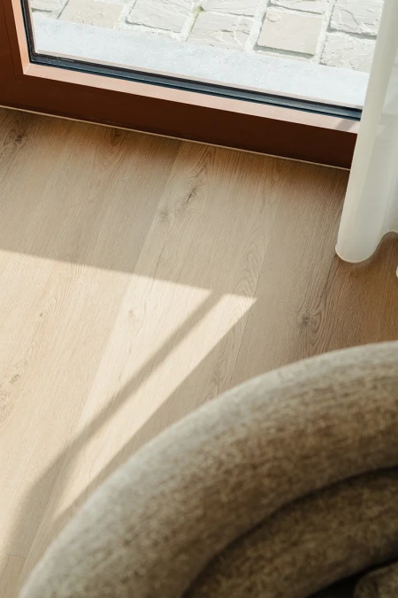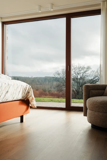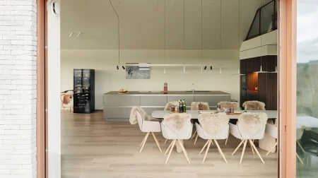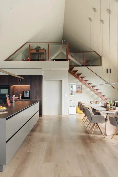 För golvbeläggningen valdes Parquetvinyl. Ett beslut som både estetiskt och praktiskt passar perfekt in i husets koncept. Det naturliga träutseendet ger värme till de moderna rummen, medan de underhållsvänliga egenskaperna är idealiska för en semesterbostad som används intensivt. Resultatet? Ett golv som inte bara är vackert, utan också tål vardagens slit.